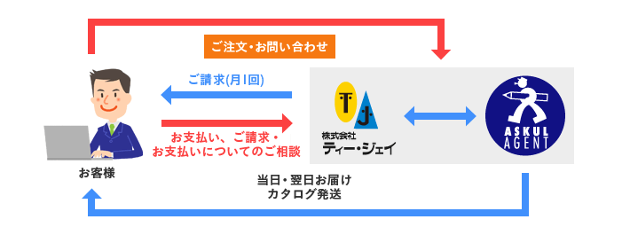 オフィスで必要な事務用品、家具、食料品など約3万5千点のアイテムを取り揃えFAXまたはインターネットによる注文で翌日までに商品をお届けするアスクルの代理店として便利な商品を提供しております。